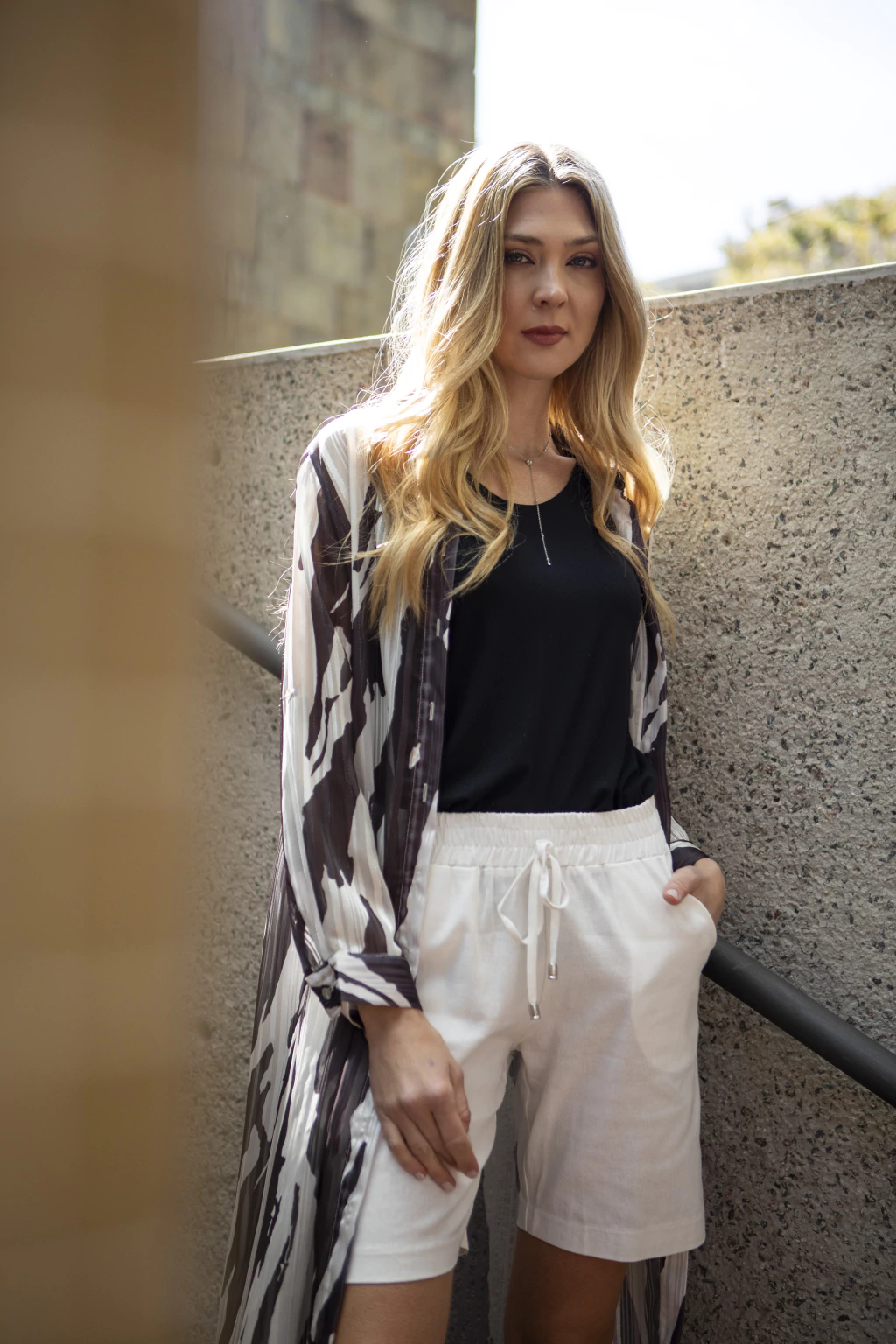 Camisola larga estampada con diseño abstracto. De caída fluida y textura liviana, ideal para usar como sobreprenda o pieza central del look. Su silueta amplia aporta frescura y versatilidad, perfecta para complementar desde shorts hasta pantalones o vestidos.